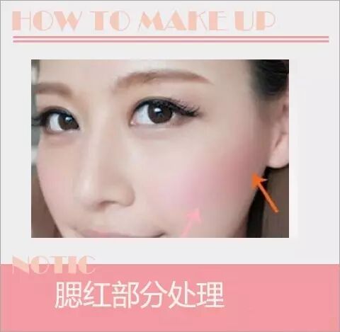 接下来是腮红部分,在眼睛下方刷粉色腮红,耳朵前面刷深橘色腮红,让两种腮红巧妙的拼接令脸部更立体。