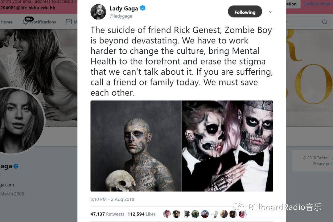 “朋友Rick Genest,僵尸男孩的自杀超出了震惊,”Gaga写道。“我们必须更加努力地改变文化,将精神健康带到最前沿,消除我们无法谈论的耻辱。如果你正在遭受痛苦,今天就打电话给朋友或家人。我们必须互相挽救“。