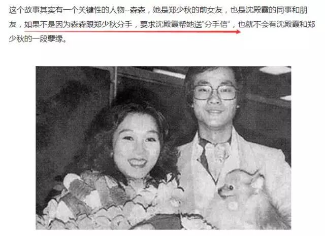 两人的感情戏剧般的源于一封分手信:当时沈殿霞的搭档森森和郑少秋本来是一对恋人,有一次森森拜托沈殿霞给郑少秋带封信,不料郑少秋看完信竟然哭了。