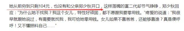 他女儿心里应该是对父亲有怨恨的,因为她打小就由肥姐抚养,缺少父爱,甚至连生活窘迫的时候宁愿辞掉司机和保姆也不愿跟郑少秋要钱。