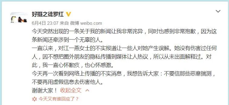 在江一燕发布澄清微博后,罗红也微博澄清了二人的关系,他表示,“一直以来,对江一燕女士的不实报道让一些人对她产生误解。她没有伤害过任何人,因不想把圈外朋友的隐私传播到媒体让人热议,所以从未出面解释过。对此,我一直心怀歉疚,也心怀感激。”