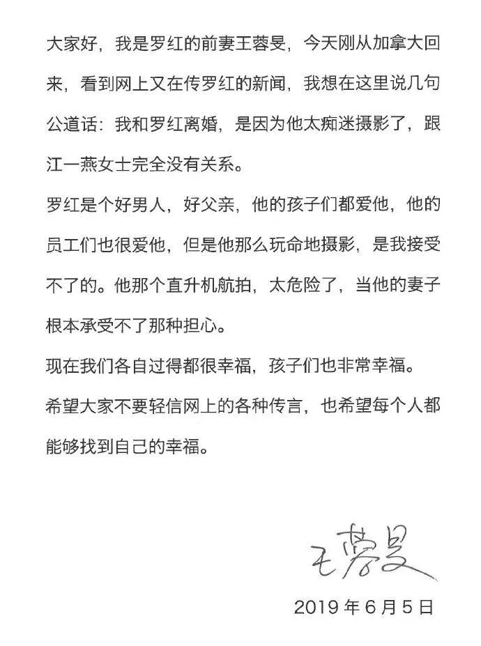 不但如此,罗红的前妻王蓉旻因为没有微博,但是她通过罗红的微博,发布了声明,她十分清楚地说明,自己和罗红离婚的原因是因为摄影,并不是因为她人插足,和江一燕女士毫无关系。