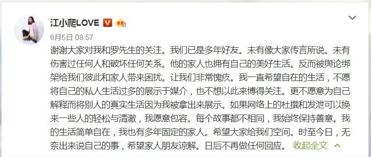 尽管罗红和江一燕恋爱的新闻时有出现,并且传闻二人很可能会结婚,甚至已经隐婚,但是在江一燕方面,她从来没有承认过,并一直表示自己未婚。直到这一次插足传闻出现后,江一燕首次澄清她和罗红之间的关系。6月5日,江一燕发布微博称,“我和罗红先生是多年好友,未有伤害过任何人和破坏任何关系。”,“他的家人也拥有自己的美好生活。反而被舆论绑架给我们彼此和家人带来困扰。”