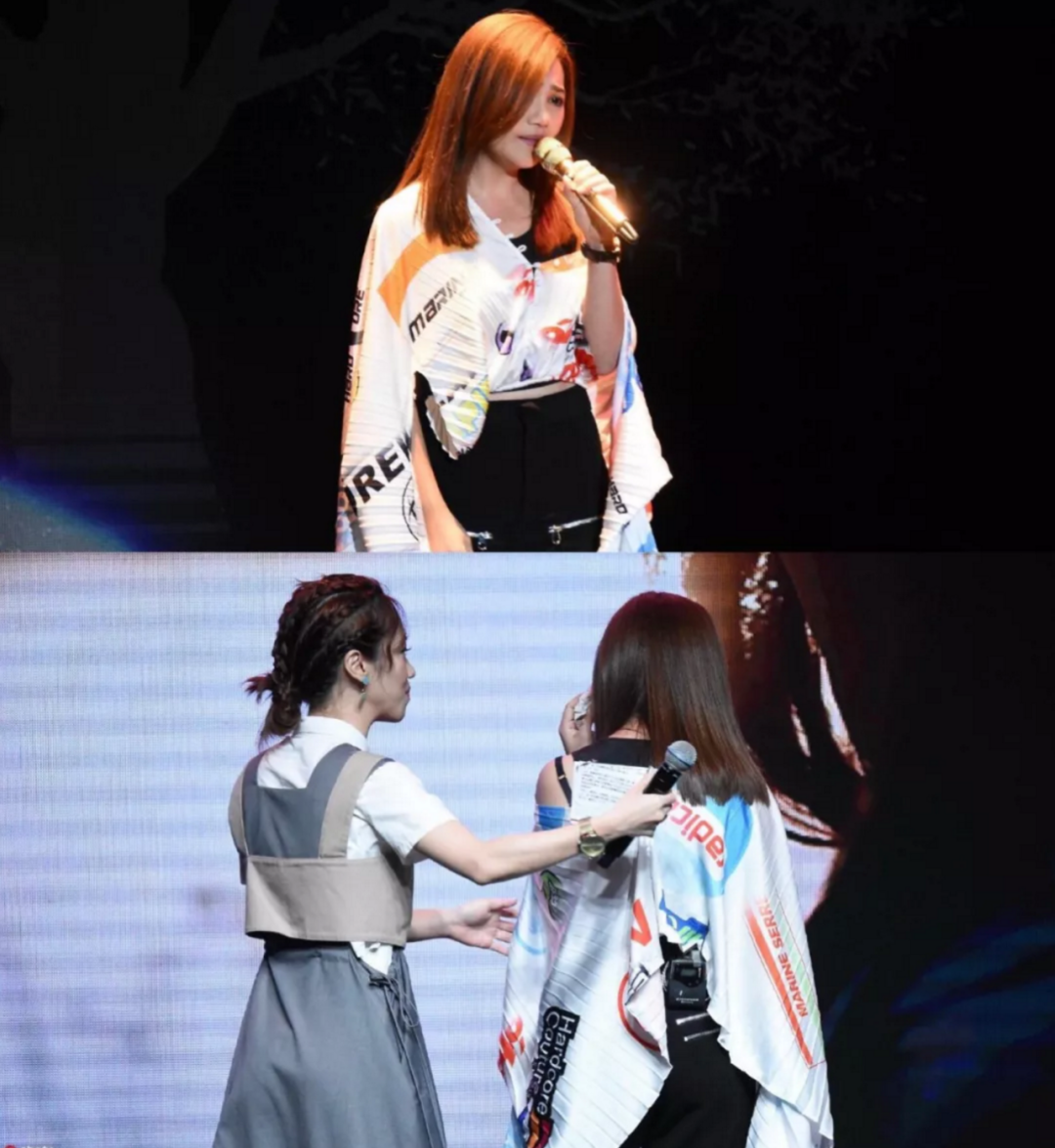 在演出中,她哭了两回。唱《分手快乐》时,她一度哽咽失声。唱到《可惜不是你》时,她又蹲在台上,痛哭长达 1 分钟时间。