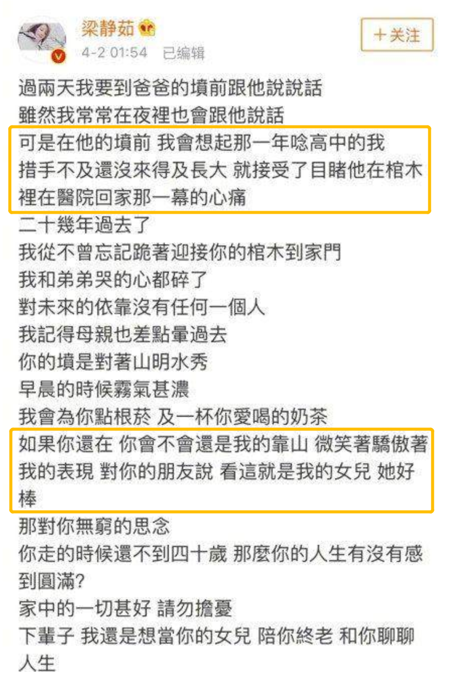 只可惜,梦想虽然生了根,还没等到开花结果,梁爸爸就因鼻咽癌猝然离世了。