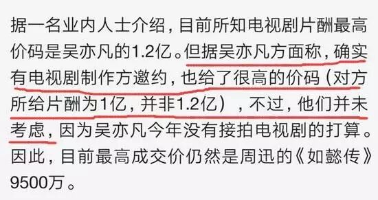 在这份片酬表中,更值得关注的是这几位当红小鲜肉的报价,吴亦凡以1.2亿 的天价高居榜首,鹿晗则紧随其后,然后是杨洋(那份报价居然把名字都打错了,要扣钱啊)不过,吴亦凡和杨洋都先后发表了声明,否认报价。但同时吴亦凡那边也自爆,确实有制片方开价1亿请他拍电视剧,可是,他!居!然!拒!绝!了!