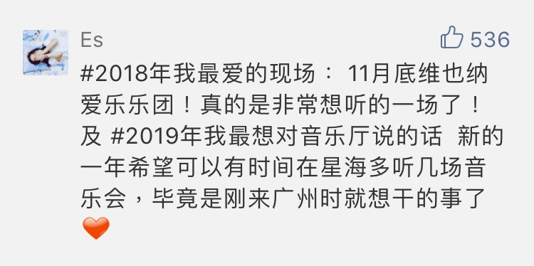 欢迎在文末讨论区留言:#2018年我最爱的现场 及 #2019年我最想对音乐厅说的话。