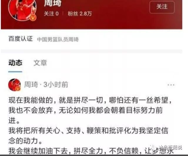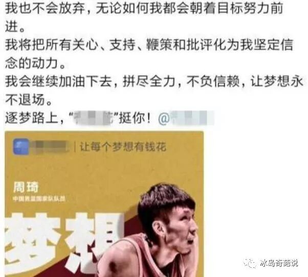 就在前两天,消失很久的周琦在自己的个人社交平台上发表了一篇鸡汤。周琦说现在他能做的就是拼尽一切,朝着目标努力前进,把所有的鞭策和批评化为坚定的信念动力。坦白说鸡汤的内容还是不错的,也是值得大家肯定的,球迷们不是不能原谅周琦的过错,而是不能原谅他犯错后的态度。但是在周琦发完这篇鸡汤之后,紧接着配上了一个图,这个图片竟然是他为某网贷公司代言的宣传图!临了周琦还说了一句:什么什么网贷公司,挺你!
