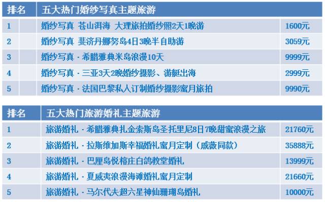 根据携程旅游今年网上订单,报告发布了2017婚礼主题游热门榜单,大理苍山洱海、斐济丹娜努岛、希腊雅典米岛、三亚、法国巴黎等入选五大婚纱写真主题游;希腊扎金索斯岛、拉斯维加斯、巴厘岛、夏威夷、马尔代夫入选五大婚礼主题游。