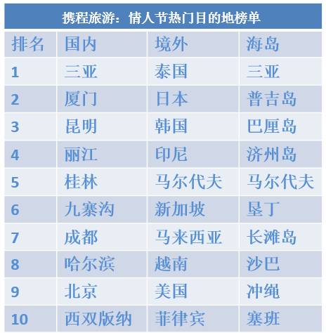 哪些目的地成为情人节出游首选?携程报告还发布了2017年情人节旅游目的地排行榜,国内方面,三亚、厦门、昆明、丽江、周庄、九寨沟、成都、哈尔滨、北京、西双版纳人气最高,旅游者偏爱浪漫型目的地、温暖海岛以及自然环境好的目的地。出境方面,泰国、日本、韩国、印尼、马尔代夫、新加坡、马来西亚、越南、美国、菲律宾,排名前十名。海岛目的地成为情人节最大赢家,携程报告显示,情人节前后出境游,海岛游占到近40%。