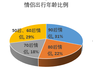年龄方面,今年旅游过情人节的人群呈“一老一少”两个极端。携程旅游数据显示,90、00后情侣占比最高,占到31%。80、70后则是旅游消费主力,一共占四成。有趣的是,“老情人”也加入罗曼蒂克的大军。今年旅游过节的情侣中,46岁以上的情侣占到29%。报告认为,有钱有闲的中老年人也追求重温浪漫,已经成为情侣蜜月旅游的重要消费人群,不少是子女网上下单送爸妈去过“二次蜜月”。