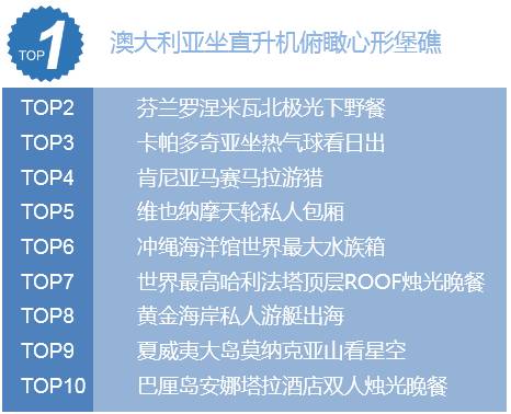 携程旅游还根据海外玩乐产品的预定情况和用户调查,发布了最浪漫、最适合求婚的十大场景。包括澳大利亚坐直升机俯瞰爱心型的堡礁、芬兰罗涅米瓦北极光下野餐、卡帕多奇亚乘坐热气球看日出、肯尼亚马赛马拉游猎、维也纳摩天轮私人包厢等。