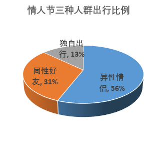 是哪些人群热衷旅游过情人节?携程分析了网上报名情人节旅游的数据发现,异性情侣占比56%,其次是同性好友占比31%。独自出行的单身狗也不甘寂寞,占比13%。携程旅游专家分析,虽然异性情侣占领了情人节前后的旅游市场,特别是年轻人、新婚蜜月族,但同性结伴出游、一个人独自出游的群体也占了相当大的比例,特别是独自旅行的比例持续上升。