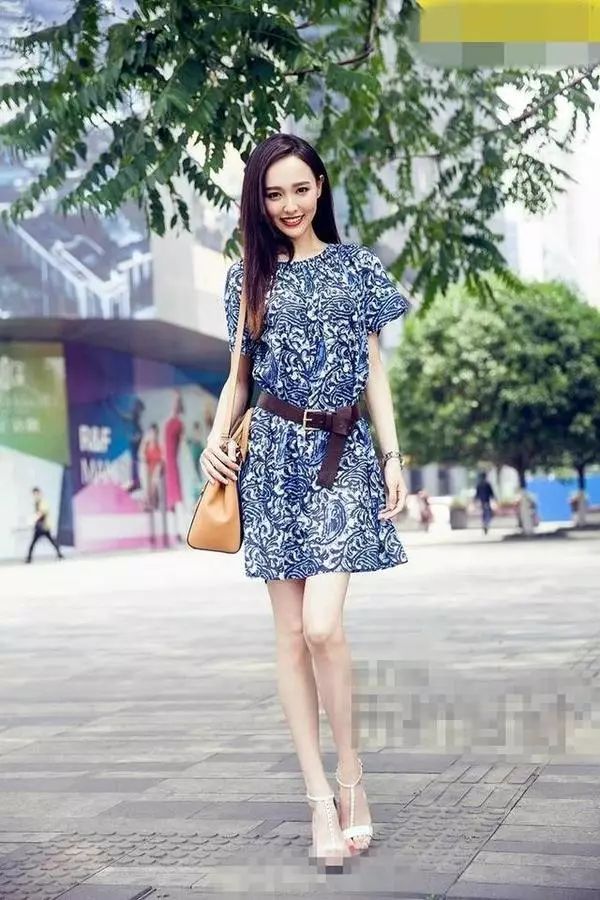 蓝色印花连衣裙清新美腻,一条粗犷皮带的搭配让柔美的连衣裙不那么甜腻,中和的恰到好处哦。