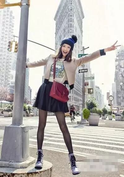 休闲的夹克搭配黑色半身裙,青春无极限。