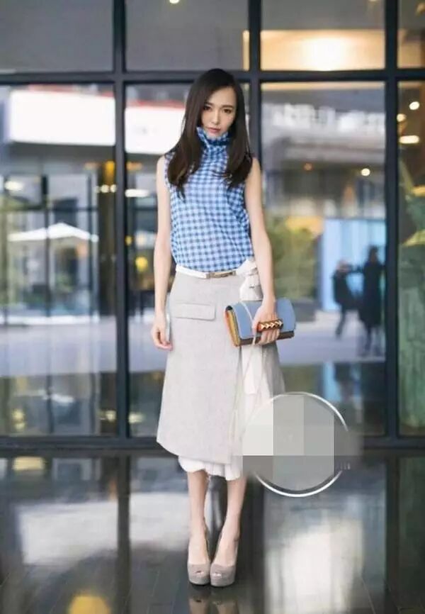 唐嫣的这一身搭配棒极了,立领的蓝色格子清新又精致,灰色的开叉裙俏皮又经典,小编给满分哦。