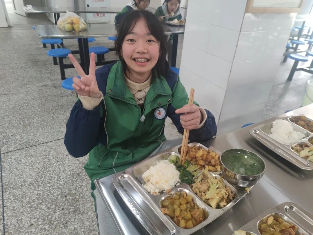 红烧肉丸 宫保鸡丁 榨菜豆花 蚝油生菜 棒骨小白菜汤 红豆饭 苹果