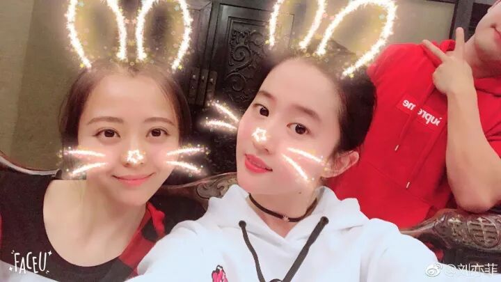 照片中,刘亦菲和张靓颖自拍卖萌,兔子造型十分可爱。