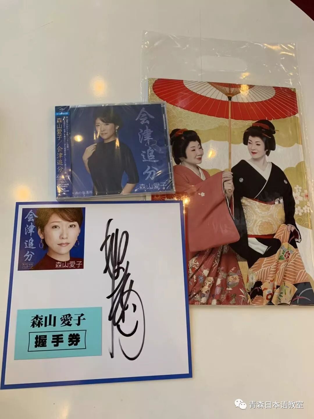 我把纸条放到了装有茶叶的小袋子里,走到了出口。此时,森山爱子早已在出口跟拥有握手券的歌迷握手。轮到我时,我走上前去,跟她握手,她朝我微笑点头并说“ありがとうございます”。我说“爱子能否帮我一个忙,有件礼物能否帮我转交给冬美。”森山爱子好奇地问我从哪里来,我说从中国来的。她说我真厉害,并跟工作人员说这一袋是给冬美的,一定妥善放好。她告诉我会转交给冬美的。我连声说了谢谢,并说她的新歌《会津追分》很好听,森山爱子说她会继续加油的!