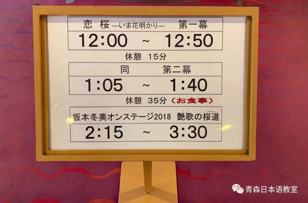 到了这里,我才知道门票是包含两部分演出的,第一部话剧《恋樱》和第二部坂本冬美小型演唱会《演歌之樱道》。两部之间会休息35分钟。心里想想,冬美真是不容易,一边饿着肚子,一边要打起精神为大家演出。这就是作为一名艺人的不易之处。