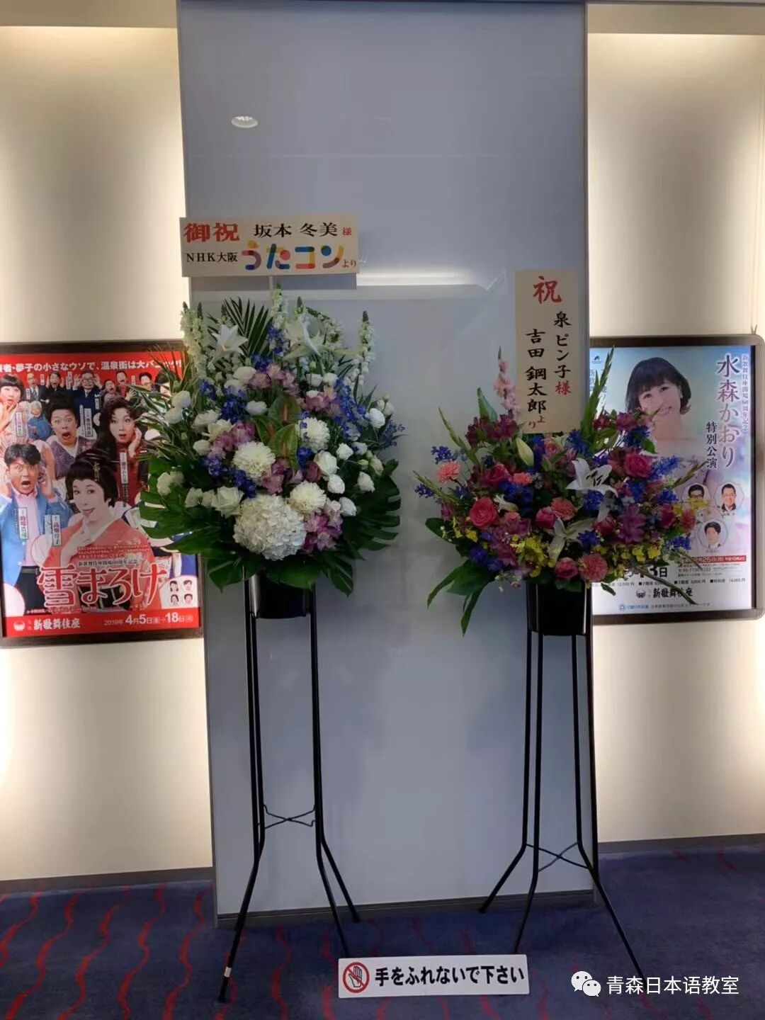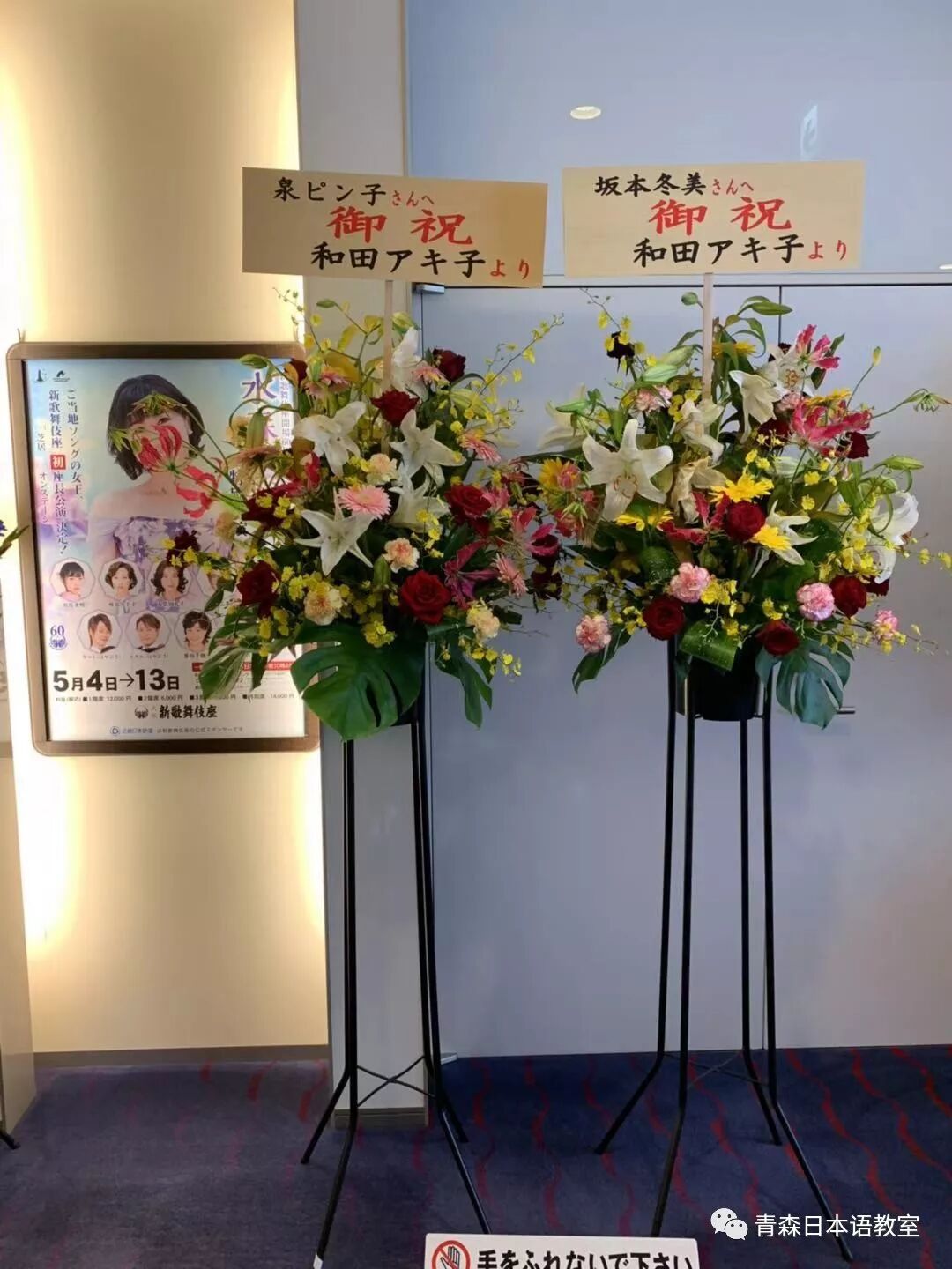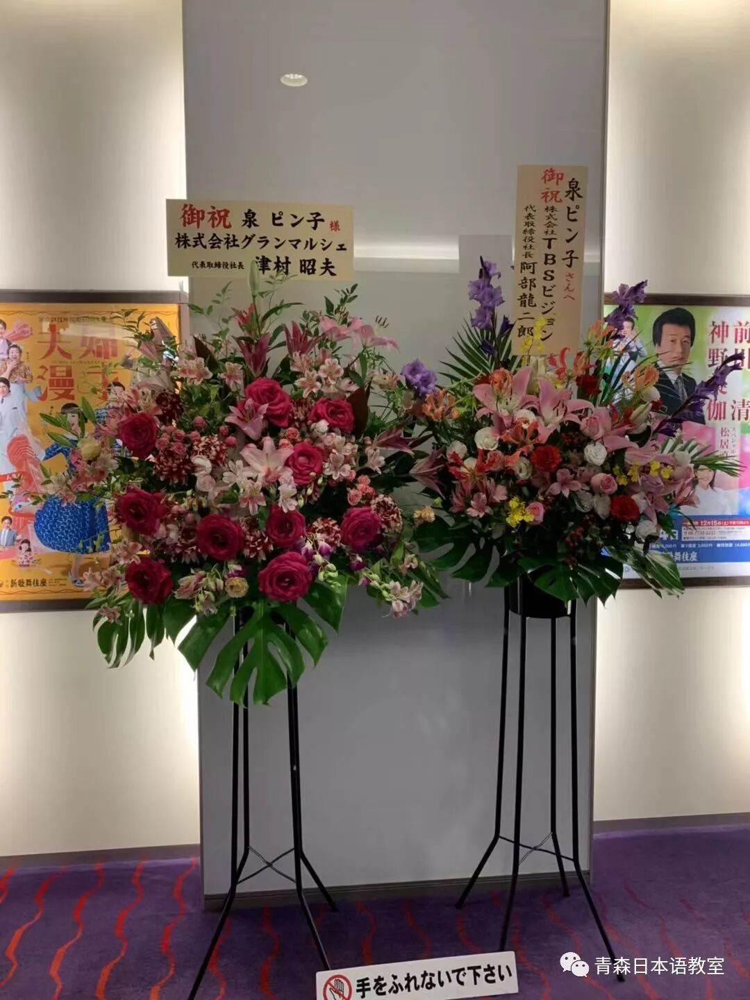 看到剧场门口的对面有一些公司、广播电视台等送给冬美和泉ピン子的鲜花。我迅速拿起手机开始一路拍照。