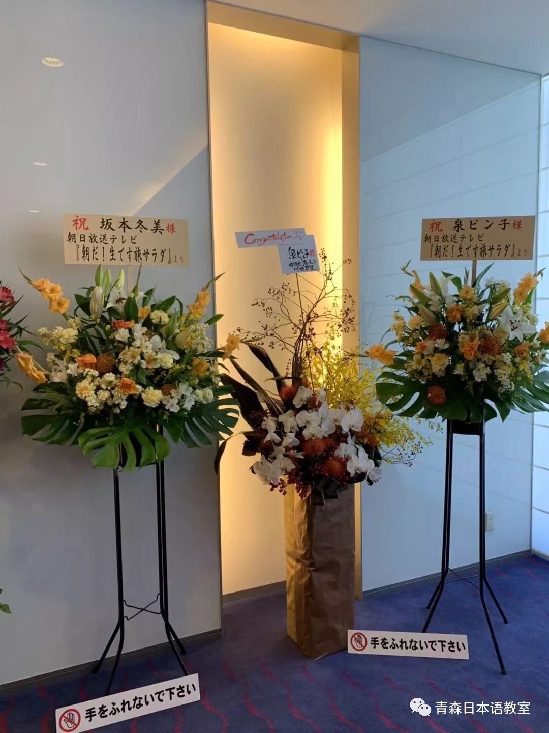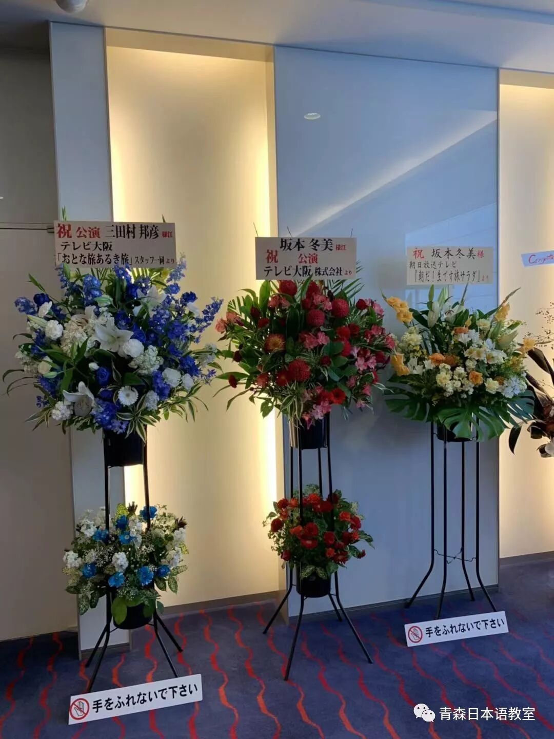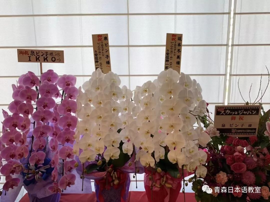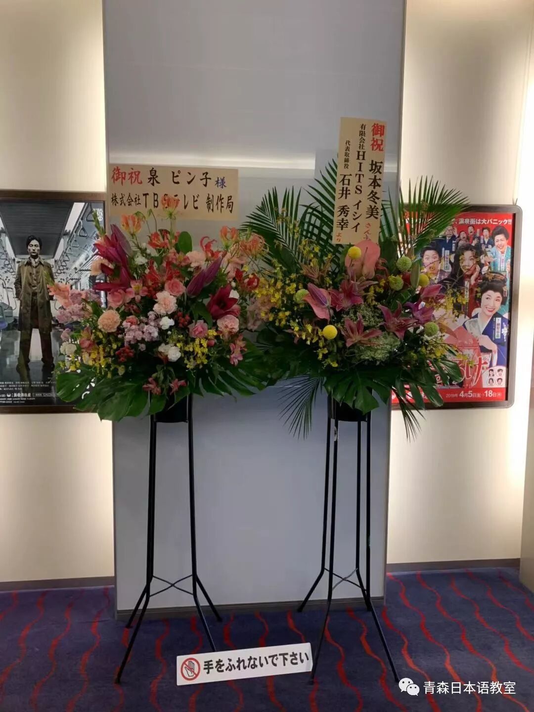 看到剧场门口的对面有一些公司、广播电视台等送给冬美和泉ピン子的鲜花。我迅速拿起手机开始一路拍照。