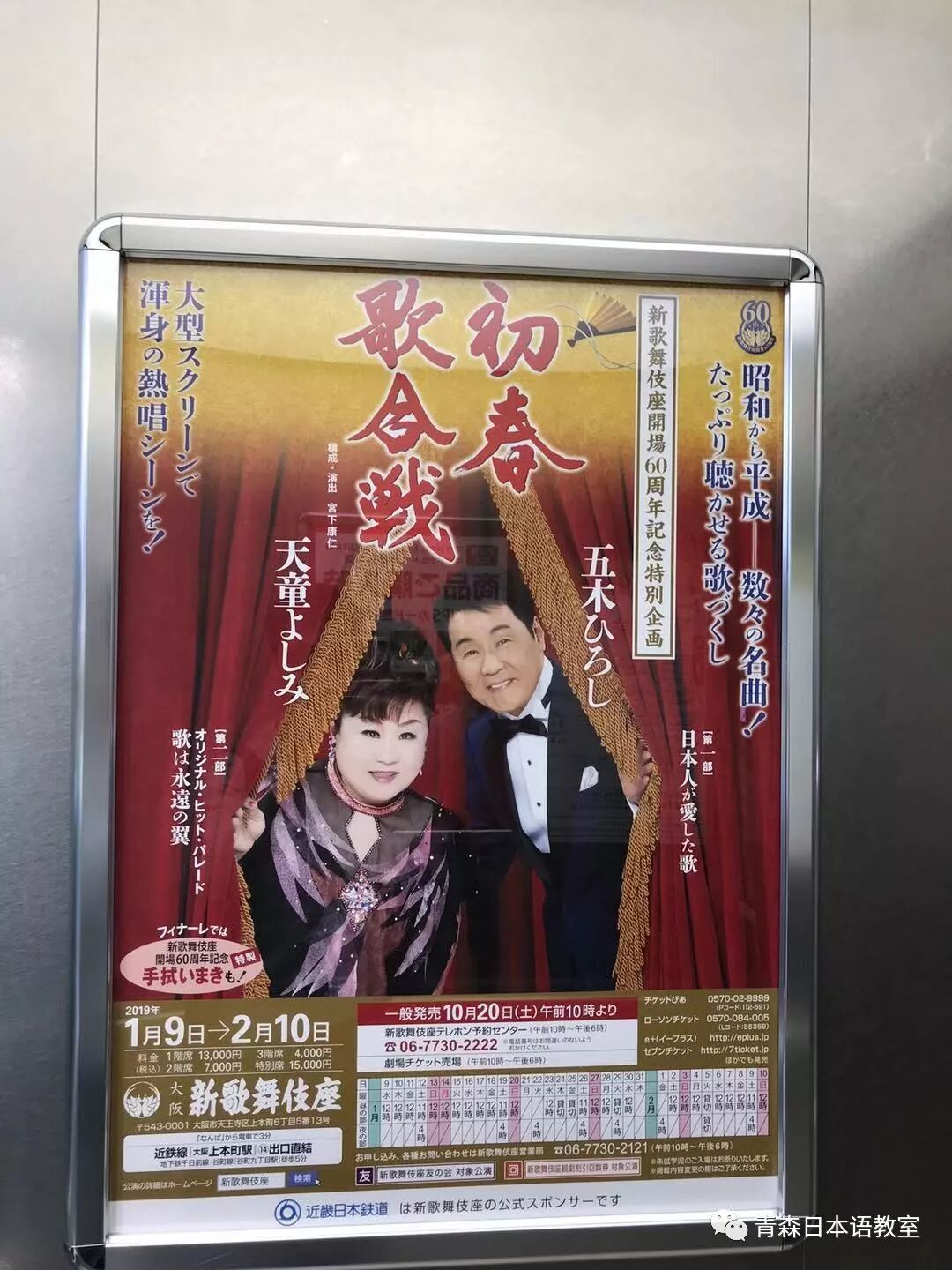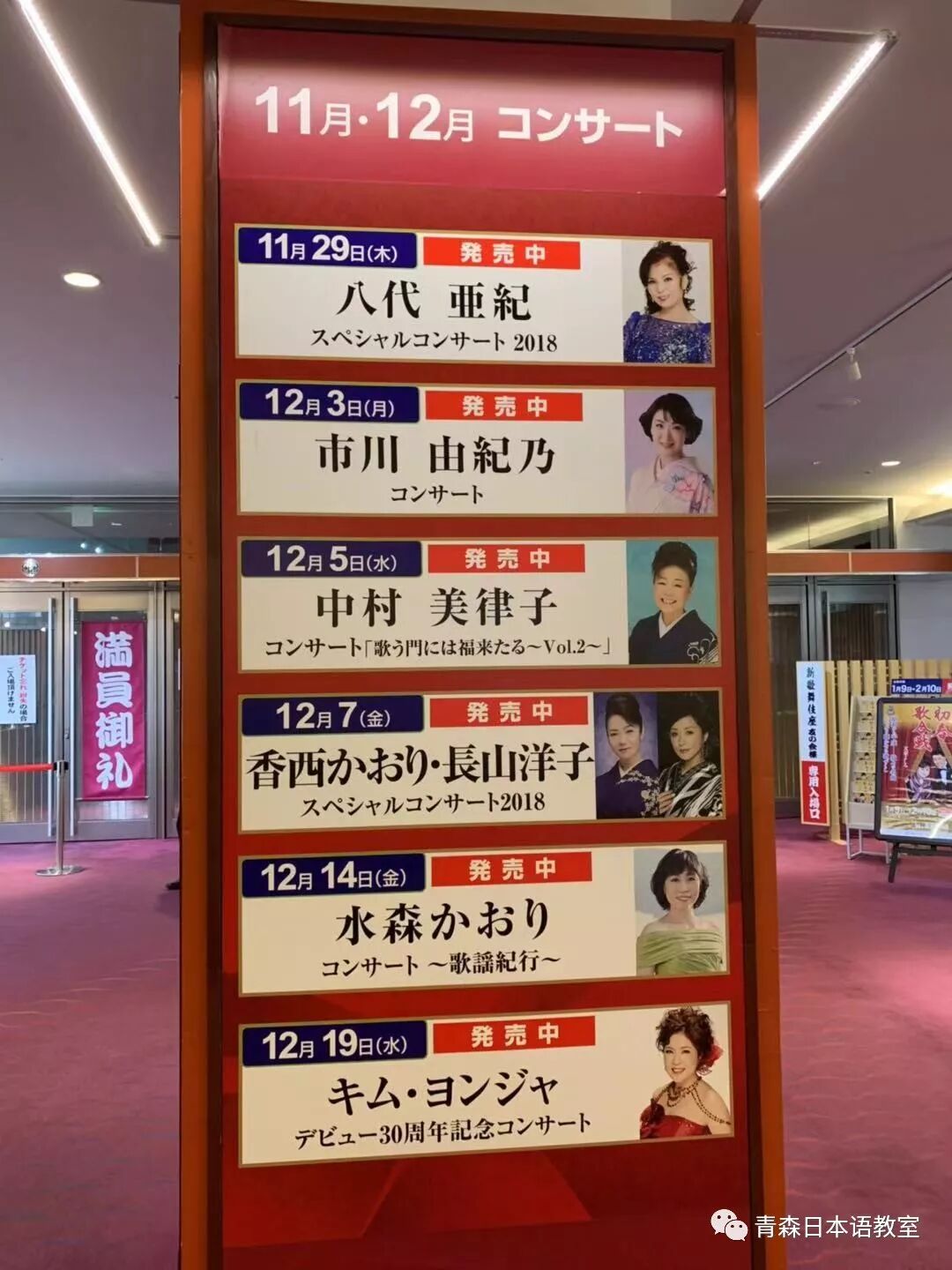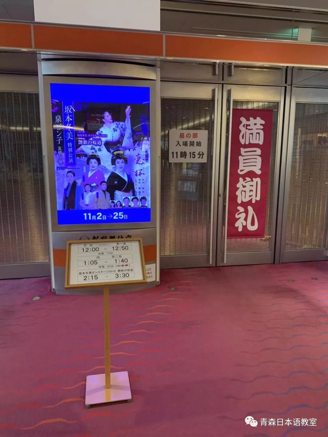 拍完照后,我乘坐电梯到达位于大楼6层的新歌舞伎座。公演实际开始时间是12点整,11点15分可以入场。我到达6层时应该是10点20分左右,门口主要是工作人员和贩卖便当的人。该层的走廊里到处都是熟悉演歌歌手的演出预告。