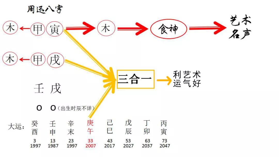 周迅八字中,食神多,故有利于演艺、艺术、名声名气发展。33—43岁走庚午大运,庚午大运的“午”与命格中的“寅”、“戌”构成三合,有利于艺术发展。在这个阶段周迅在演艺事业上一直很顺利,包揽各种国际大奖。