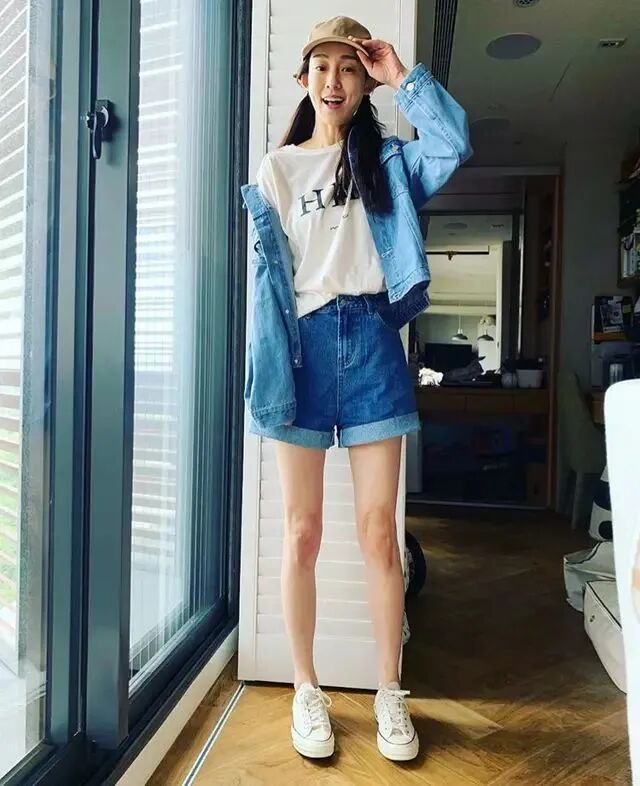 粉色短袖搭配的是一条黑色的短裤,还挺可爱的呢,很像是少女的穿搭。不过素颜真的不怎么好看了,因为显老以前素颜给人一种很干净的感觉,现在只会让人觉得沧桑。