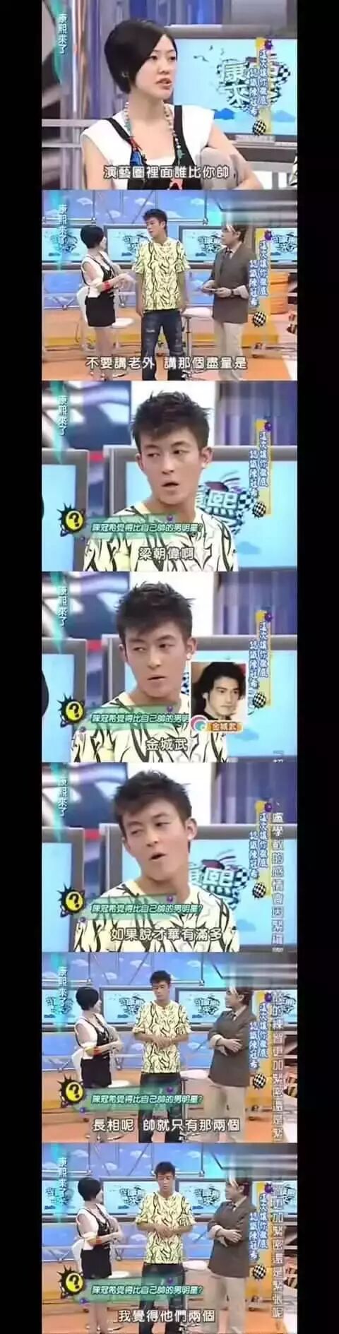 小s问他,演艺圈谁比你帅,还限定范围,不准讲老外。陈冠希给出了一个真诚而不失自信的答案。