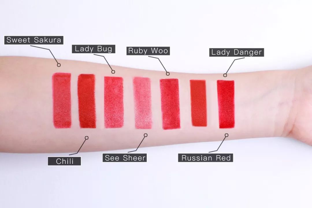 一共有 7 个猎爱色号,从左到右分别是:Sweet Sakura,Chili,Lady Bug,See Sheer,Ruby Woo,Lady Danger,Russian Red。