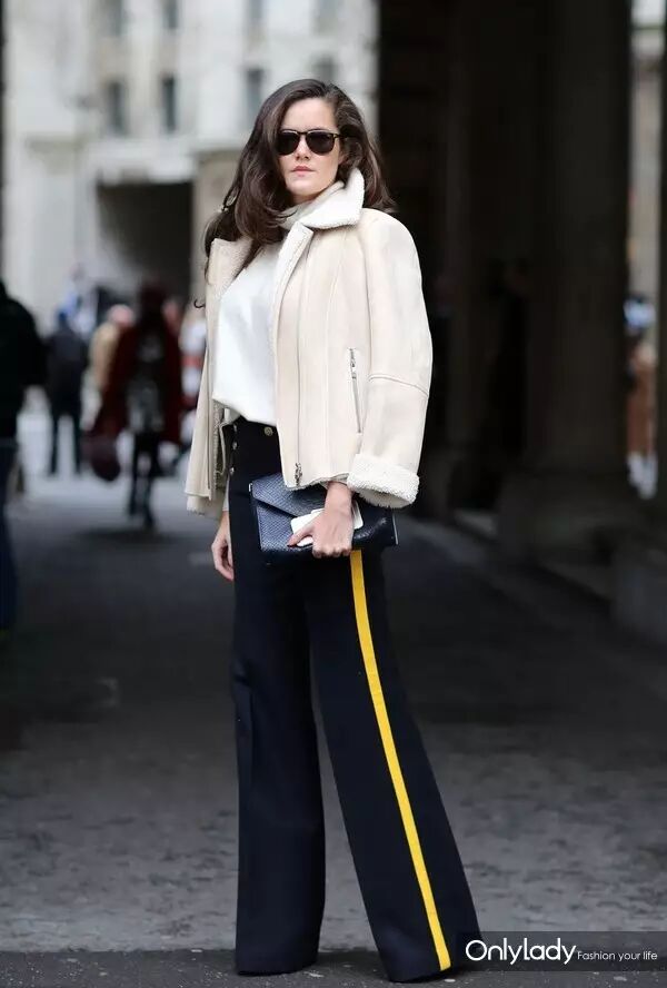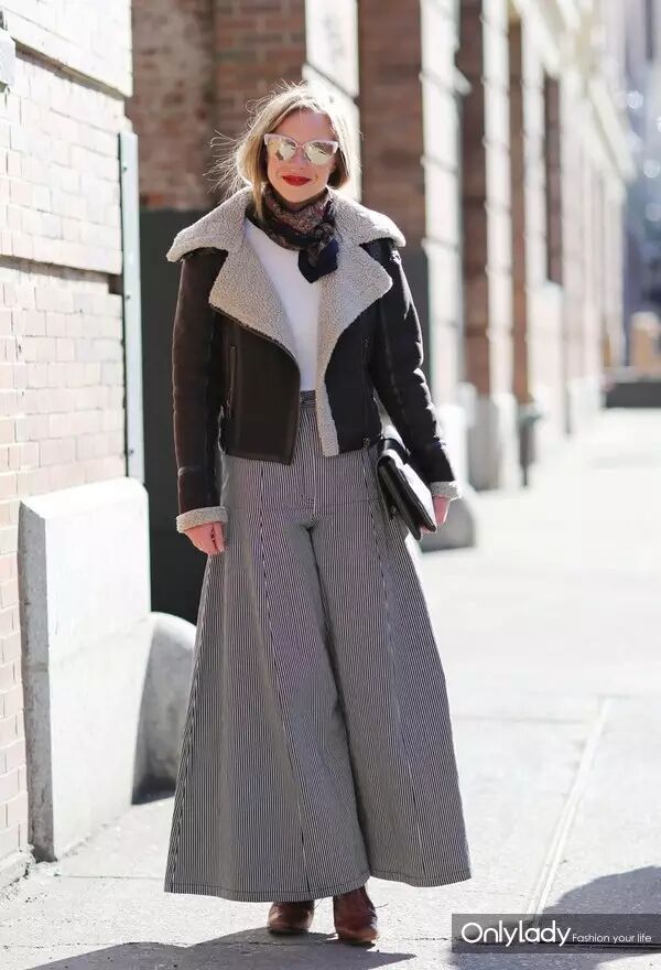 很多时尚潮人在穿短款皮毛一体外套时,会倾向于选择阔腿裤。