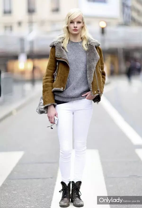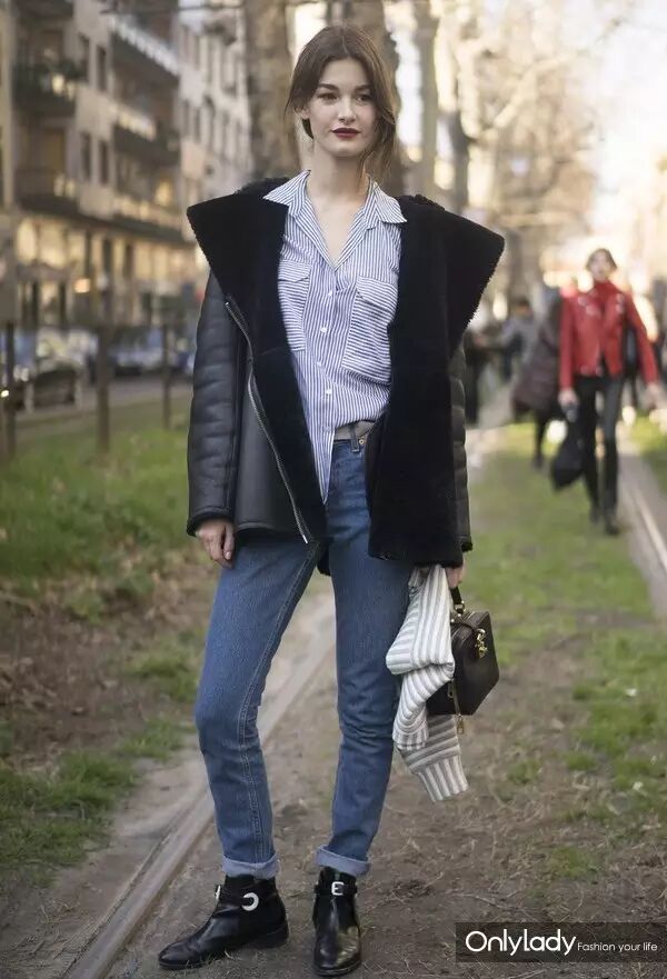 配修身牛仔裤,美腿妹子专属。对于美腿星人来说,短外套搭紧身仔裤毫无压力,在冬天依旧要炫耀好身材。