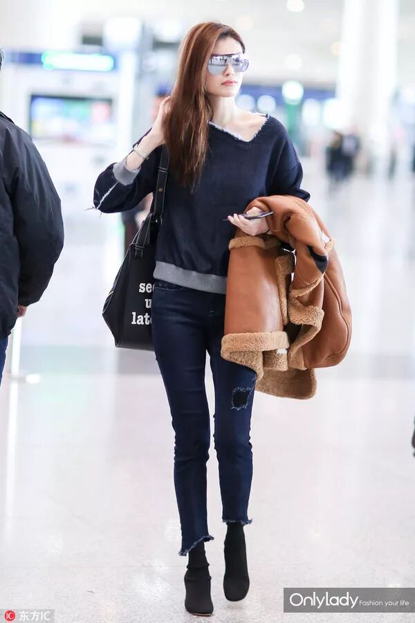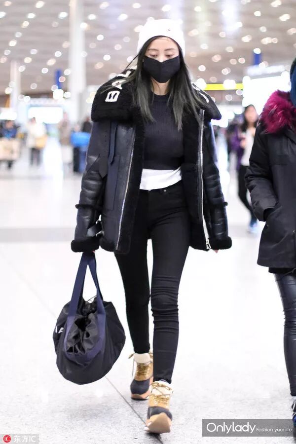 张天爱用黑色羊羔绒外套搭配紧身牛仔裤,简约中又有时髦感,与此同时,一件羊羔毛外套显出奢华感。
