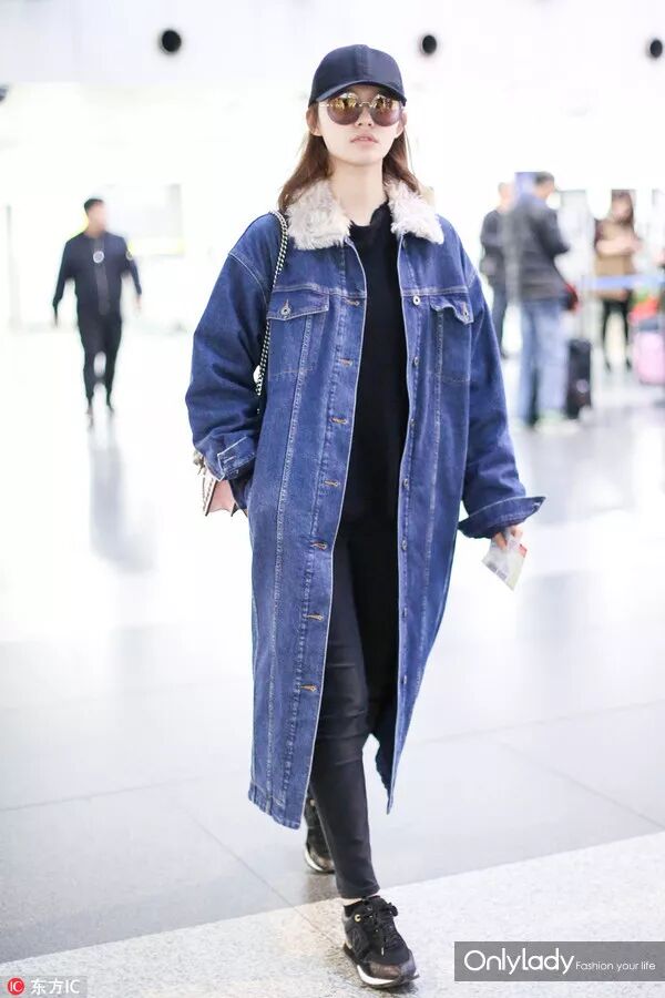 林允的羊羔绒外套稍有不同,长至脚踝的牛仔外套增加保暖度,整体造型更为简洁。