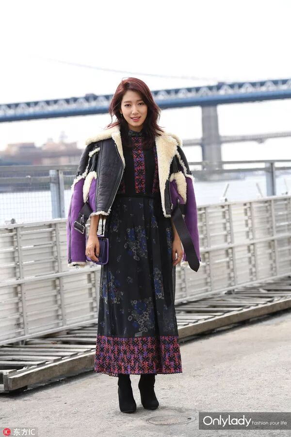 朴信惠今年参加时装周的这件Coach用紫色羊羔绒外套搭配连衣裙,温柔优雅又高级。