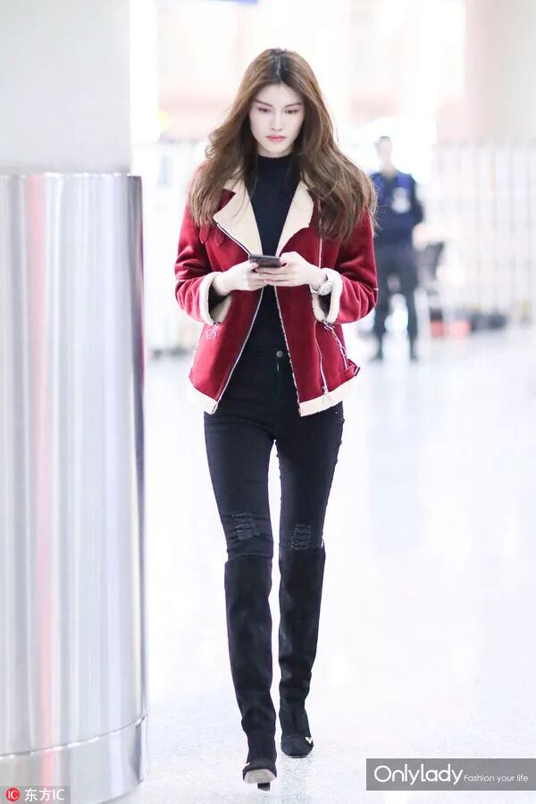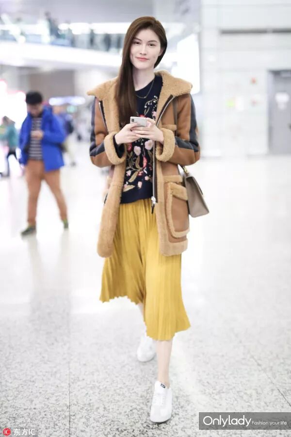 在最近的街拍之中,常常可以见到何穗对羊羔绒夹克的偏爱。从酒红色的短款外套,到棕色的长款羊羔绒外套,无论是搭配裙装还是简单的牛仔裤都十分美丽。