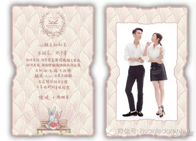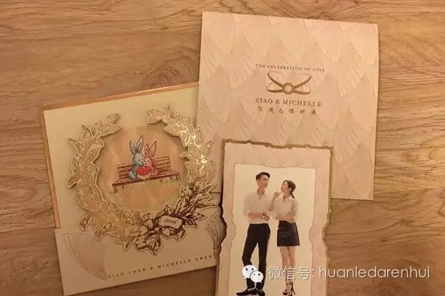 两盒饼干礼盒外印满小兔子图案,十分可爱,喜帖封面也是一对小兔子相依偎做在长椅上的图案,浓情密意,处处显露小两口的创意与巧思。