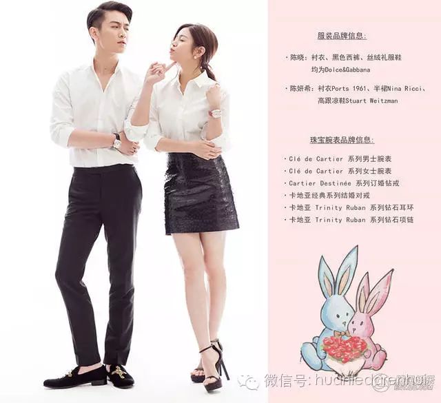 当初陈妍希一看到兔子玩偶非常喜欢,陈晓马上买下来送她,加上陈晓属兔,所以两人的定情物就是兔子玩偶,也不时会用和兔子相关的表情符号、物品传情。陈妍希曾开玩笑说,婚礼很有可能也加入兔子的元素,也许会要求宾客都戴着兔耳朵进场,后来这个桥段不会用,台北婚宴有 dress code,要求男宾穿灰或白色系服装,女宾则穿肤色、粉红色系,北京场则有露天的证婚仪式。