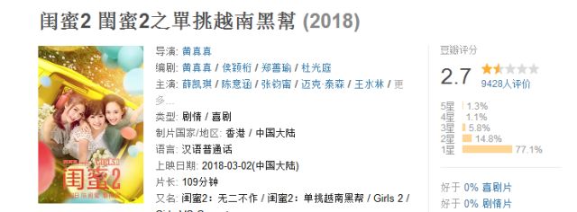 所以《闺蜜2》在IPTV一上线,桂酱第一时间就看了。至于这部片子好不好看呢,我们先来看看豆瓣网友的评分情况,简直是一言难尽。