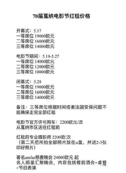 这几年经常有参与戛纳红毯的报价单,今年网络上流传的报价是这样↓