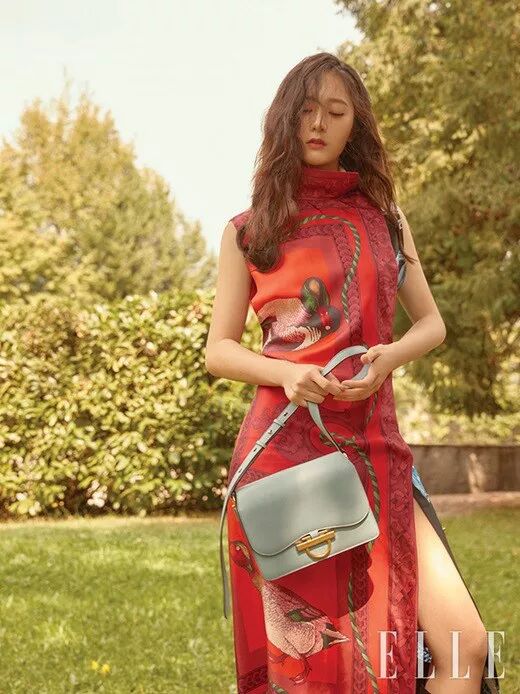 曝光照片中,郑秀晶身穿一条红色的仿旗袍裙,慵懒的卷发发型令其妩媚动人。