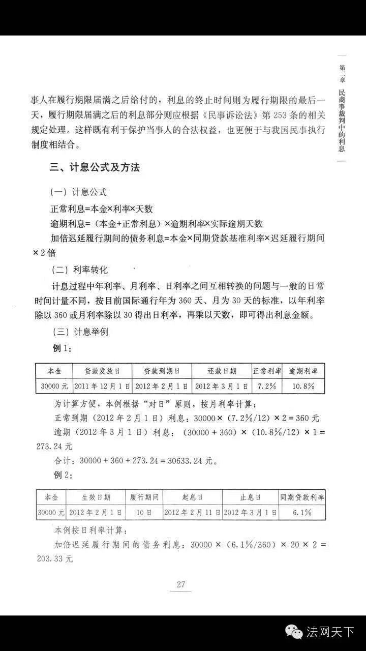 3、最高院法官杨心忠撰写《涉诉利息法律实务》,在该书中第27页也明确表述:“按目前国际通行年360天、月为30天的标准,以年利率÷360或或月利率÷30得出日利率……”(以下为图书照片)