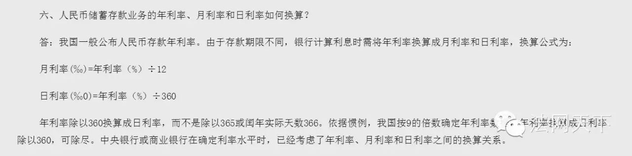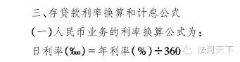 中国人民银行曾发文《关于人民币存贷款计结息问题的通知》(回复“日利率”可以得到官网链接),在该文曾明确了换算公式