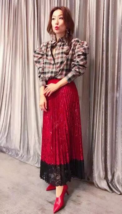 黑白格纹衬衫简单休闲,泡泡袖款式充满女性柔美的气质,下身穿着红色百褶长裙搭配尖头高跟鞋优雅浪漫。