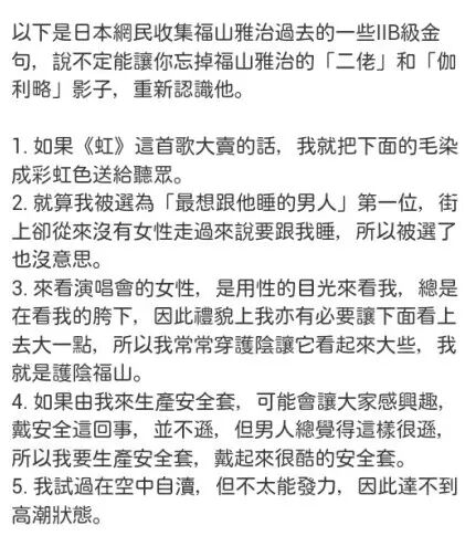 福山桑是工口段子能手很多人也知道,什么演唱会不穿内裤啊、因为有洁癖所以洗澡后裸体擦墙啊这些古早段子已经是他每上访谈都会重复的梗了。他这个咸湿佬的名声,主要是由于他经常在自己主持的深夜广播里说点重口味话题而声名远播。