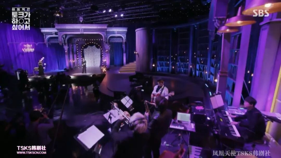 节目完全是以李栋旭的审美打造的:舞台古典中透露着摩登范儿,整体上既华丽又简洁;在舞台的中央摆上主持人和嘉宾的位置进行一对一脱口秀,可以提高集中度;节目现场有乐队,乐队里一定有铜管乐器;现场也有一些观众,营造一种温馨感……不得不说,李栋旭的审美很高级,整个棚内布景高雅、清冷,灯光也以暗色调为主,立体感和沉浸感很强。棚内布景、灯光都很讲究。