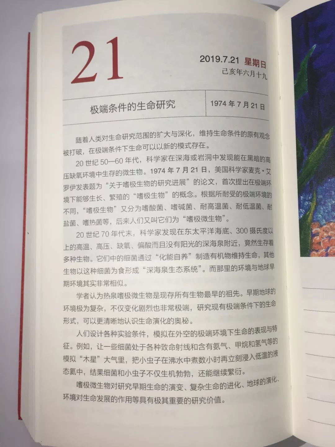 2019年4月16日温室效应首次被提出、1974年6月26日条形码首次现身超市、1911年12月14日人类首次到达南极点、1998年9月7日谷歌公司正式成立,在这本《科学日历》里,每一天你都看到一个“科学史上的今天”的小故事。