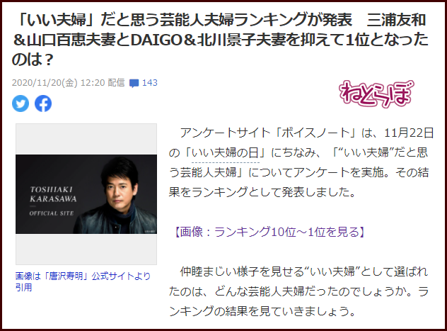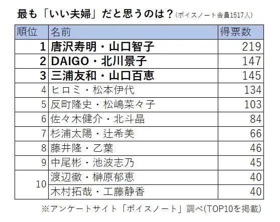 而在2020年年末发表的「日本娱乐圈最佳夫妻」排行榜中,唐泽寿明和山口智子的票数超过北川景子&daigo和三浦友和&山口百惠,荣登榜首,成为日本人心中最羡慕的夫妻。