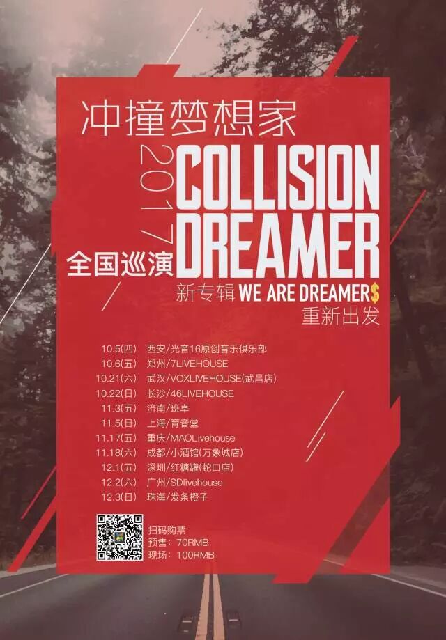 Collision Dreamer冲撞梦想家乐队,也许对很多人并不是个陌生的名字,中国首支EasyCore乐队,风格融合与跨度很大,但是总能保证你的菜就对了,8年之后重新出发,带着全新专辑<WE ARE DREAMERS>期待在你的城市与你见面!